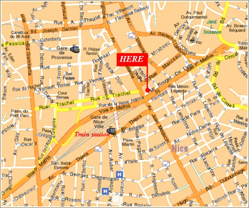 - From the Train Station: When you go out the train station, turn left as if you were going tawards the Tourist Office. Go past the Office and just stay on the left side of the street (this is Avenue Thiers). Walk one minute until you reach the first street on your left wich is Avenue Jean Médecin. Then walk down this street (you have to pass underneath the bridge) and turn to the right.